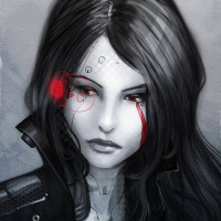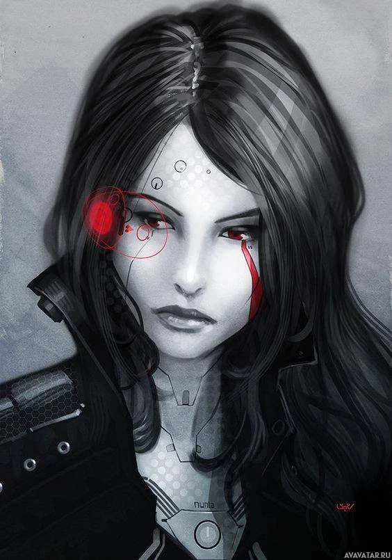 mechanical component on her forehead, adding a cybernetic or robotic element to her appearance. The artwork has a futuristic or cyberpunk theme, often associated with
