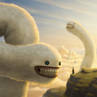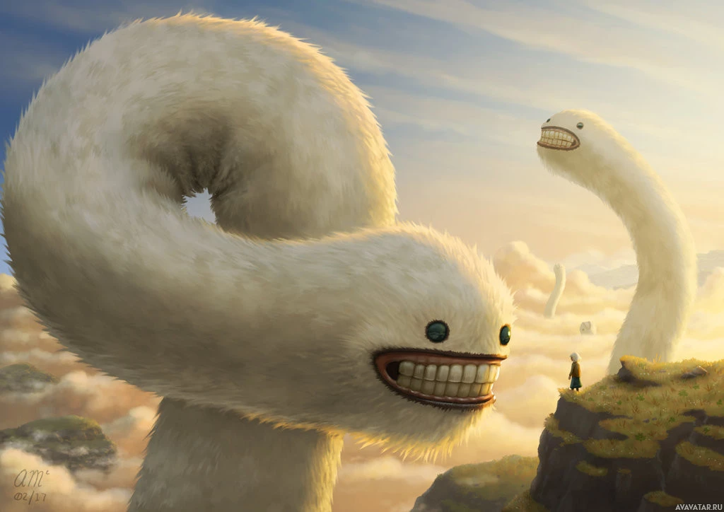 a fantastical scene featuring two large, curly-furred creatures that resemble white bears. One of these creatures has