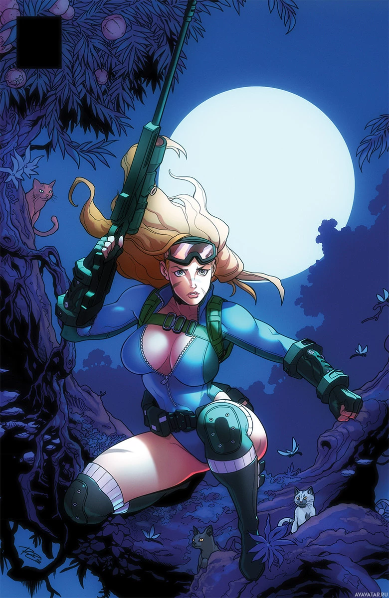 blonde hair. She is depicted in a jungle-like environment at night, and the moon is visible in the background. The character is holding what seems to be a rifle, suggesting she may be portrayed as a soldier or adventurer. The artwork is reminiscent of comic book styles.