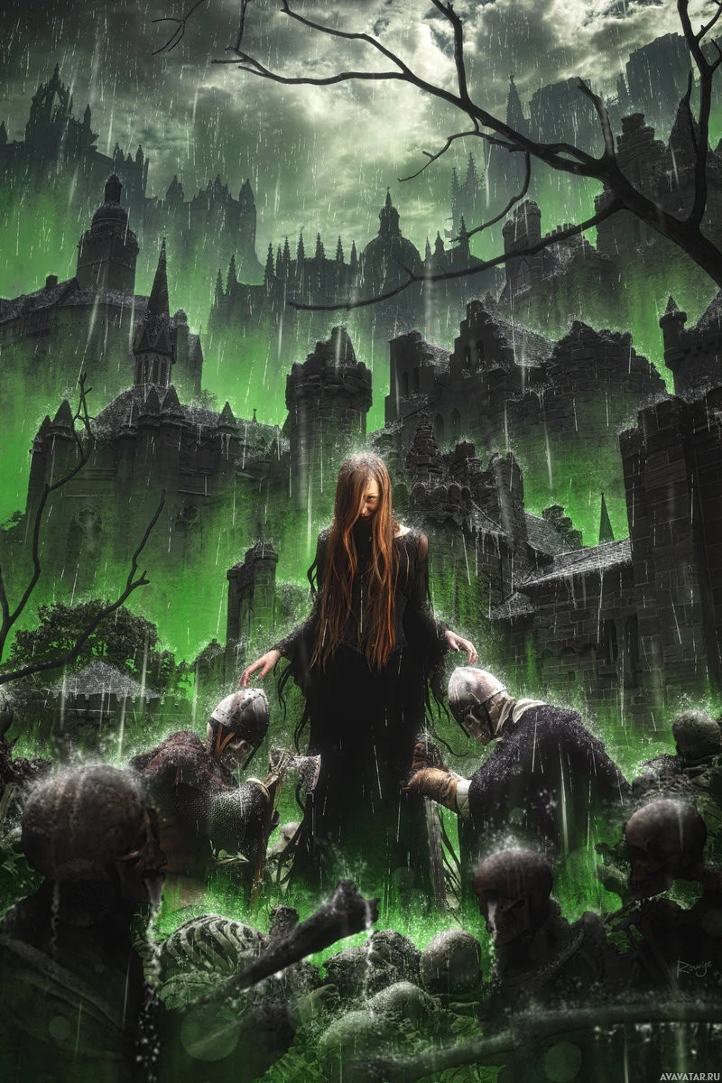 a castle ruins in the background that seem to have been destroyed, possibly suggesting an apocalypse scenario. The sky is ominous with