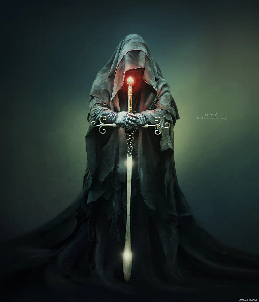 a hooded cloak and holding a long, slender dagger in their left hand, with the blade pointing towards the ground. Their right hand is clenched into a fist. The background has a dark greenish tint that enhances