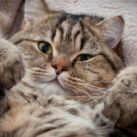 The picture shows a cat lying on its back, with its paws in the air. The cat appears to be in a relaxed and content state, possibly after playing or being stroked. Its eyes are closed, and it seems to be enjoying itself in this moment of rest.