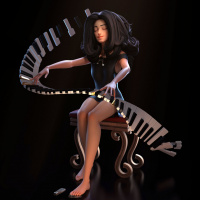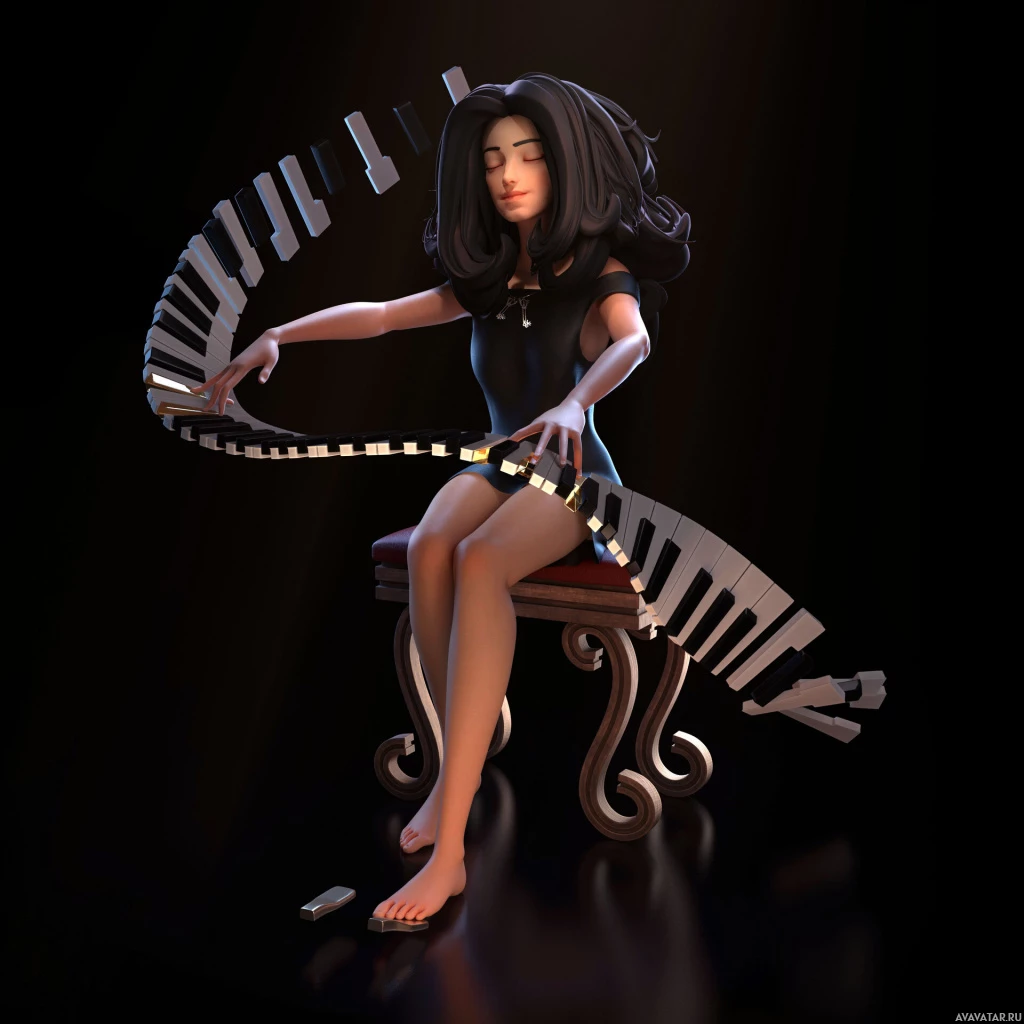 piano keys that seem to be spilling over from the piano onto her legs, suggesting a strong connection between her and the instrument. The overall impression is one of