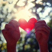 The image features a person's hands forming the shape of a heart with their fingers. The background suggests an outdoor setting, possibly during sunrise or sunset given the warm and soft light filtering through the trees. The focus on the heart shape conveys a message of love or affection.