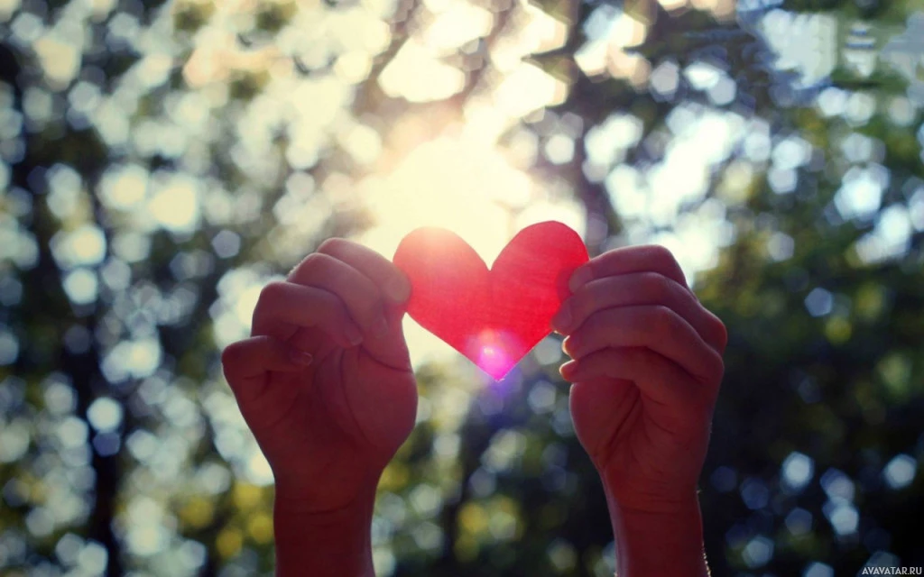 На картинке изображены руки человека, образующие форму сердца пальцами. Фон предполагает наружную обстановку, возможно, во время восхода или заката солнца, учитывая теплый и мягкий свет, фильтрующий деревья. Фокус на форме сердца передает послание любви или привязанности.