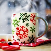 The image shows a mug with a festive winter or Christmas design, typically associated with