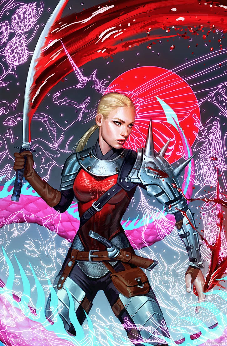 The image depicts a character that appears to be a female warrior or fantasy character. She has