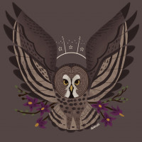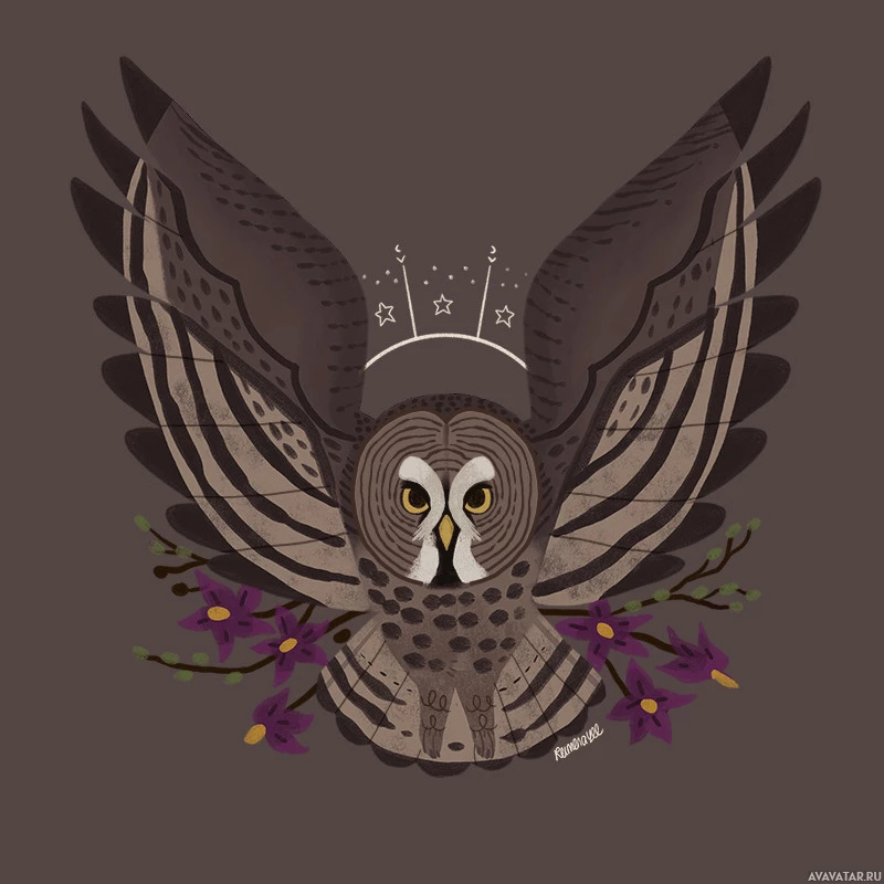 the head of the owl, there are what appear to be star-shaped designs, suggesting a mystical or celestial theme. At the bottom of the illustration, there are