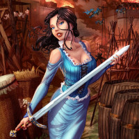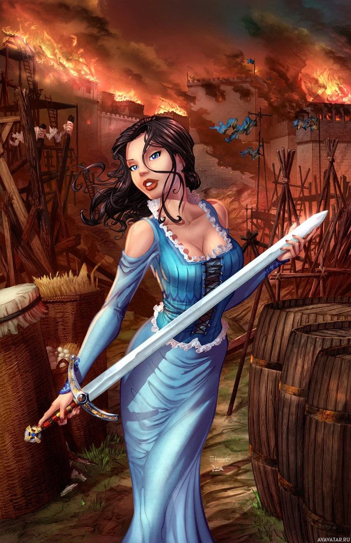 an elaborate dress and holding a sword in her right hand, suggesting she might be a warrior or adventurer. Her expression is serious and determined, indicating she may be preparing for battle or on a quest. The background suggests a chaotic or disaster-stricken environment, possibly indicating the context of the character's storyline or setting.