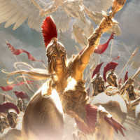 creature with wings, possibly a winged horse or a griffin, adding to the heroic and fantastical atmosphere of the scene. The color palette is rich and vibrant, with a focus on
