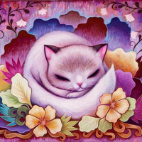 a sleeping cat. It is a charming depiction with the cat positioned in what appears to be a floral or botanical setting, as indicated by the stylized flowers and leaves surrounding it. The cat itself has a soft gray fur with