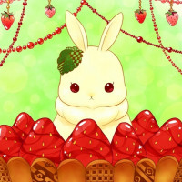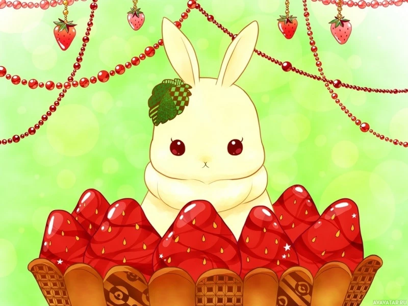 red strawberries. The rabbit appears to be looking towards the viewer, and it's wearing what looks like a decorative hat or perhaps some