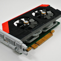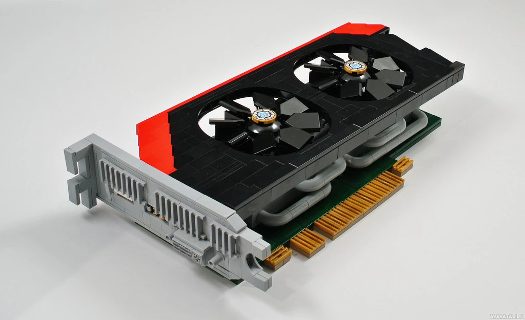 a computer hardware component, specifically a graphics card or video card, which is designed to work with the motherboard of a computer. It features a fan, presumably for cooling purposes, and connectors that are used to plug into the motherboard for power and data transfer. The background has been altered using photo editing software to create an optical illusion effect, making the card appear as if it's being "cut" by
