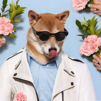 wearing sunglasses, styled in a fashionable manner. The dog is dressed in human clothing, including