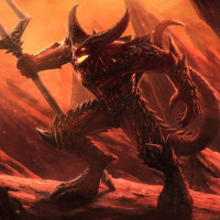red skin and horns, wielding a weapon that appears to be a trident or spear. They are standing in