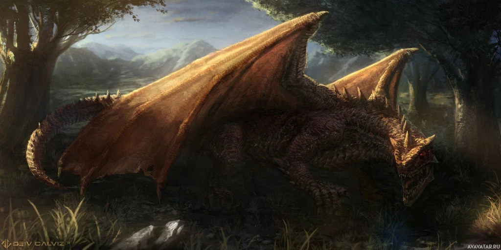 На картинке показана фантастическая сцена с участием дракона. Это, по-видимому, произведение искусства с подробным и ярким стилем, изображающее дракона в спокойной или спокойной позе, возможно, окруженной естественной обстановкой. Цвета богаты, и есть ощущение глубины и текстуры, которое предполагает, что это может быть частью более крупного фэнтезийного повествования или игры.