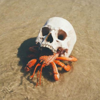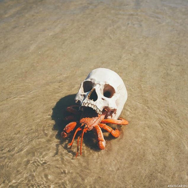 На картинке изображен красный краб с когтями, копающимися в песок, с черепом, помещенным на нем. Череп имеет пустые глазницы и расположен так, что выглядит как лицо, выглядывающее из-под раковины.