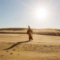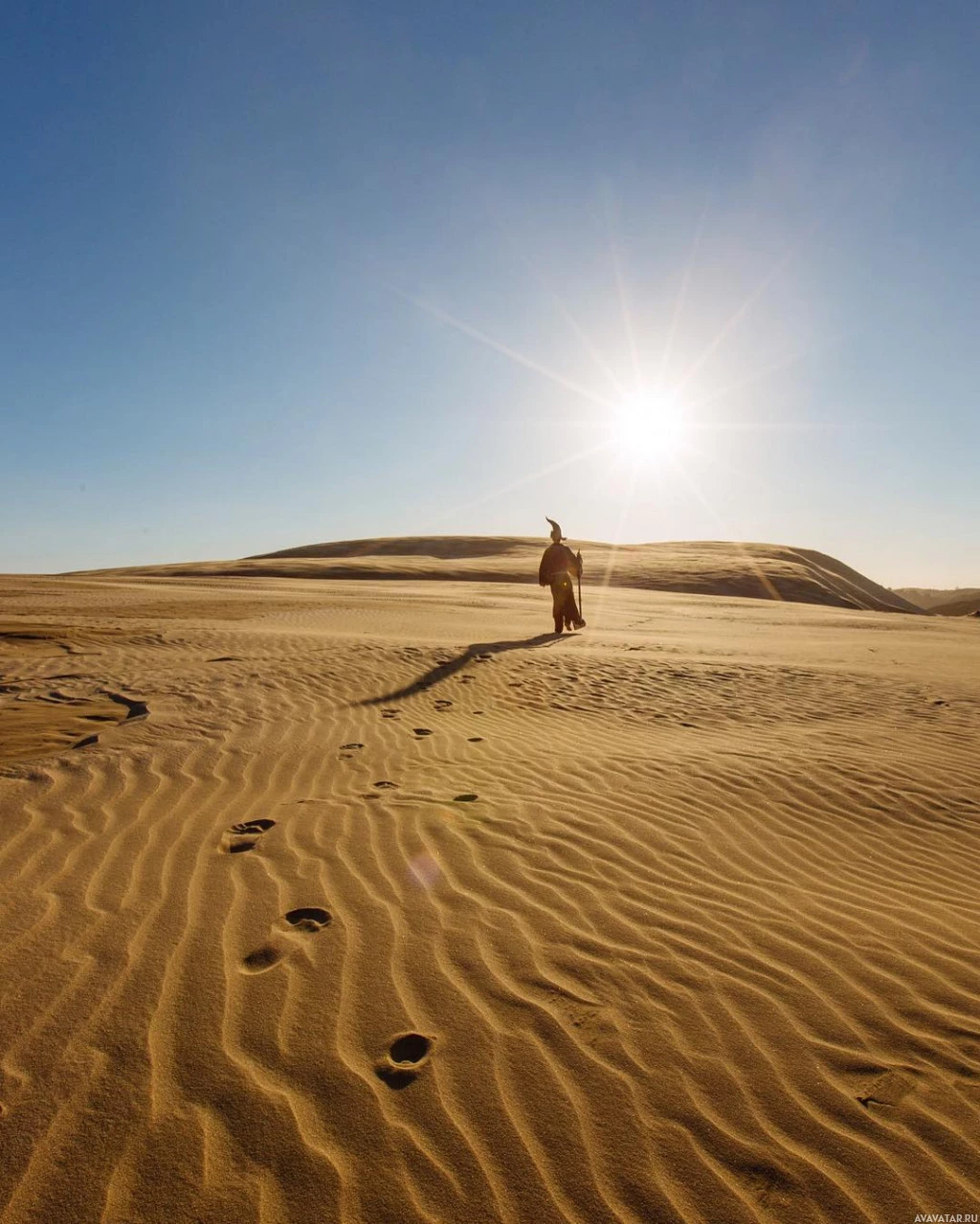 На картинке изображен силуэт человека, стоящего на песчаной местности, которая кажется пустынным ландшафтом. Человек смотрит в сторону от камеры и к закату или восходу солнца, создавая сильную подсветку, которая выделяет их форму на ярком небе. Сцена передает ощущение одиночества и величия природы.