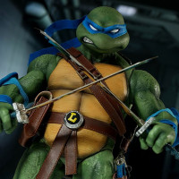 На картинке изображен персонаж, известный как Леонардо из франшизы Teenage Mutant Ninja Turtles. Он носит свой фирменный наряд, который включает в себя коричневый кожаный жилет, перчатки с серебряными костяшками-пылесосами и пару мечей, перекрещенных через его спину.