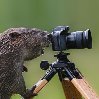 a camera tripod, as if it were taking a photograph with the camera mounted on the tripod. This creates a humorous and anthropomorphic scene where the beaver seems to be imitating