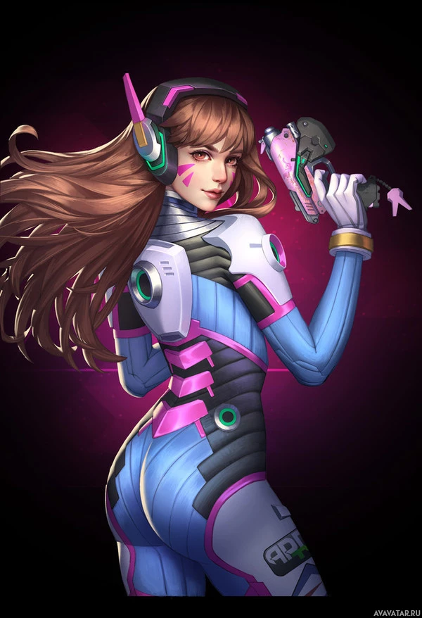 the video game "Overwatch." This character is known as D.Va, and she is depicted in her back-