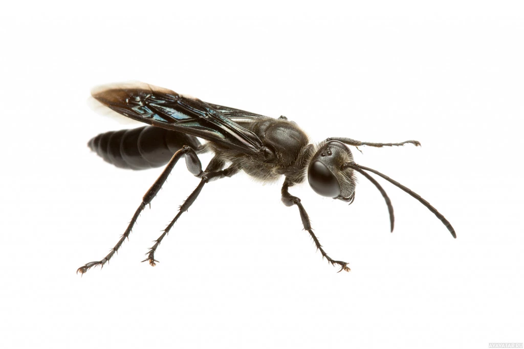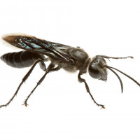 The image shows an insect, which appears to be a type of bee. It is characterized by its six legs, two antennae, and the distinct