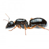 На этой фотографии изображен черный муравей с вытянутыми ногами. Муравей, по-видимому, находится в неподвижном положении, возможно, на поверхности, такой как стол или земля. Больше ничего не видно на изображении.