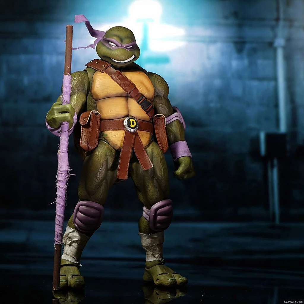 turtle shell and brown bandana with a red "D" emblem on it, along with a purple sash around his waist, which features a holster that likely holds one or more ninja weapons. Donatello is also holding what appears to be