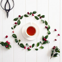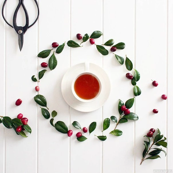 the outer edge are more of these berries, creating a semi-circle that frames the mug in the center. The background is a simple, clean surface with