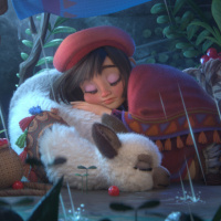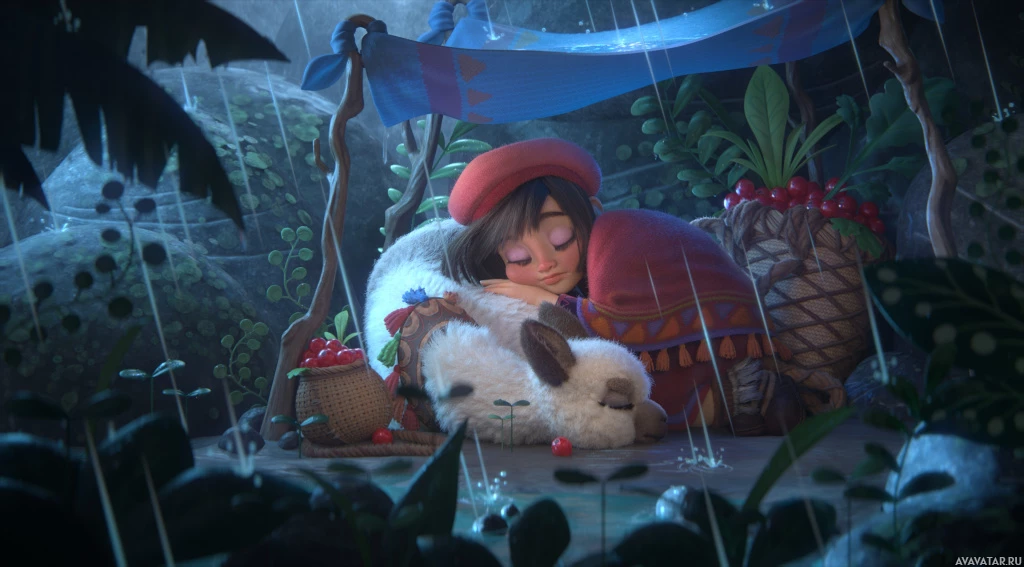 an animated scene with a child and a lama. They appear to be sitting together in the rain, with the child holding onto the lama's neck affectionately. In front of them is a basket filled with fruit. The background suggests a natural, possibly jungle-like setting, with foliage and what appears to be a makeshift shelter. The atmosphere of the image is peaceful and endearing, capturing a tender moment between two characters, likely from