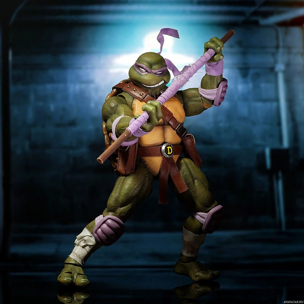 green skin, purple bandana, brown mask, and armed with a bo staff. He's wearing