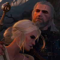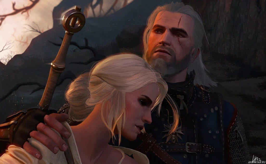 the video game "The Witcher 3: Wild Hunt," featuring the character Ciri and Geralt of Rivia. Ciri, played by actress Anna-Maja Milten, is standing in front of Geralt, portrayed by actor