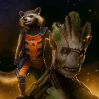 distinctive appearances: Rocket is a raccoon-like creature with a backpack, while Groot is a tree-like being known for his iconic "I am Groot" catchphrase. The background has a cosmic or space theme, enhancing