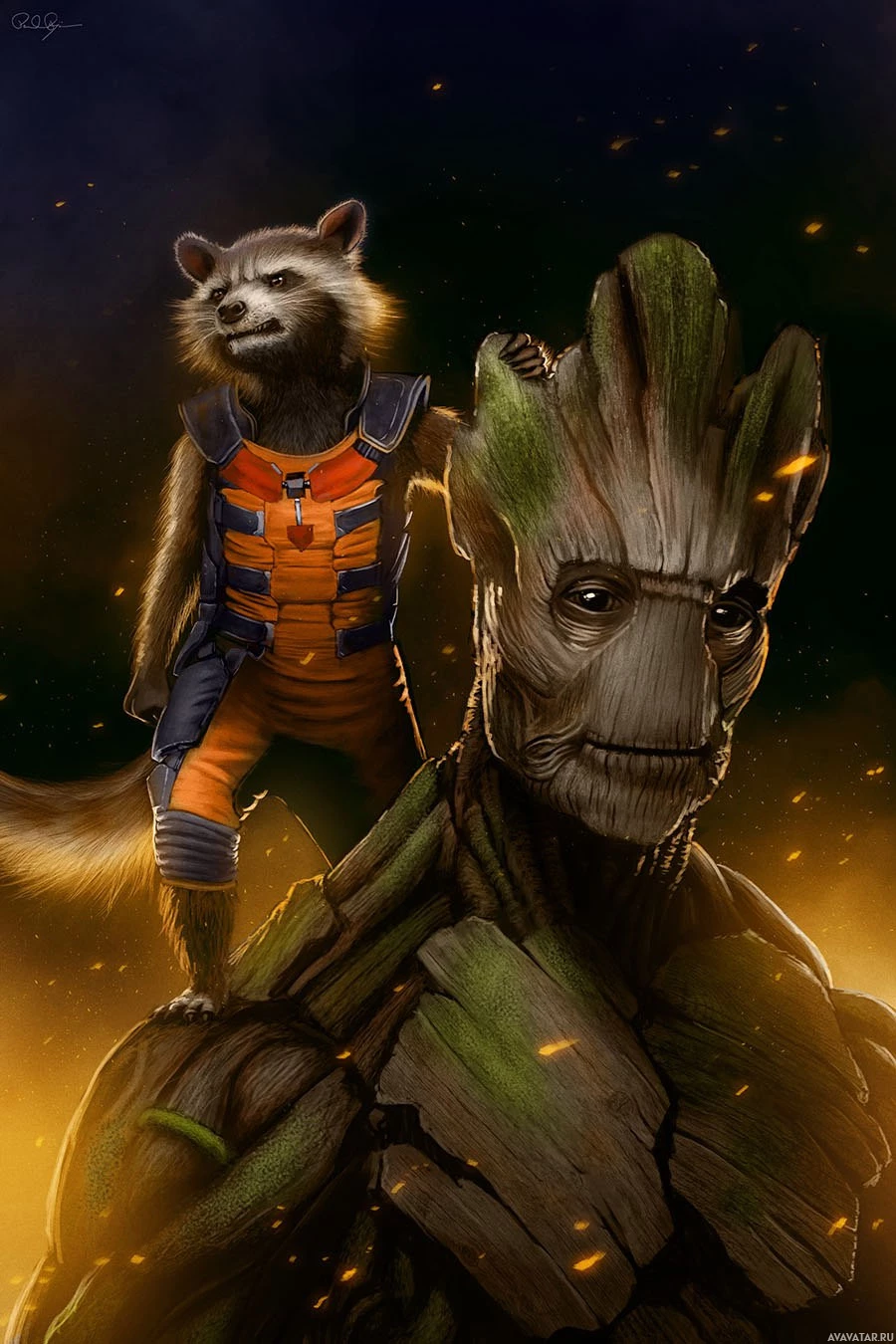 a dynamic pose, with Rocket standing on Groot's shoulders as if they are ready for action. Both characters have
