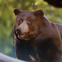 brown bear, characterized by its large size and thick fur, with the fur being darker on its head and lighter towards the bottom of its body. The bear is depicted in