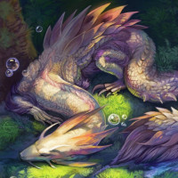 a mythical creature from a story or game. The environment around the dragon includes plants, rocks, and small