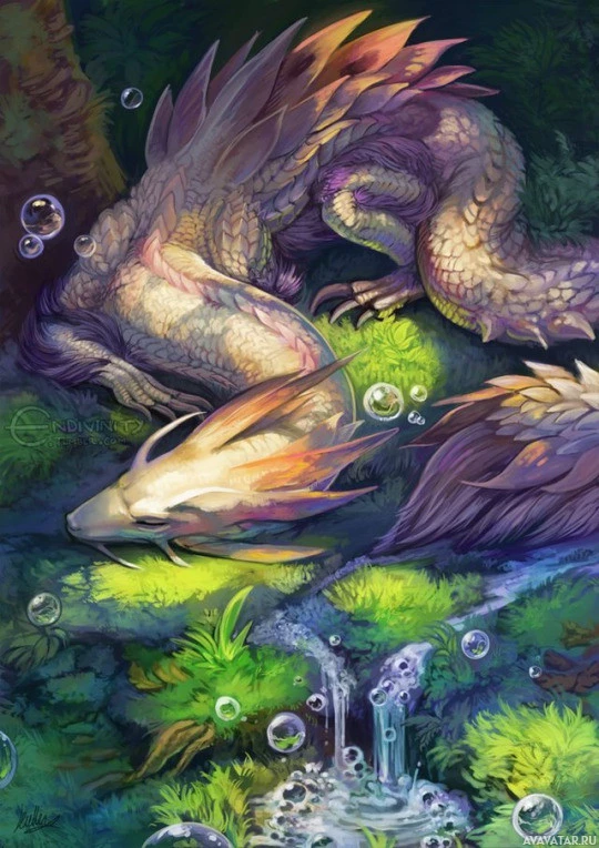 The image depicts a fantasy-themed illustration of a dragon lying on the ground in what appears to be a natural,