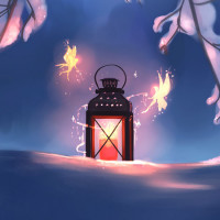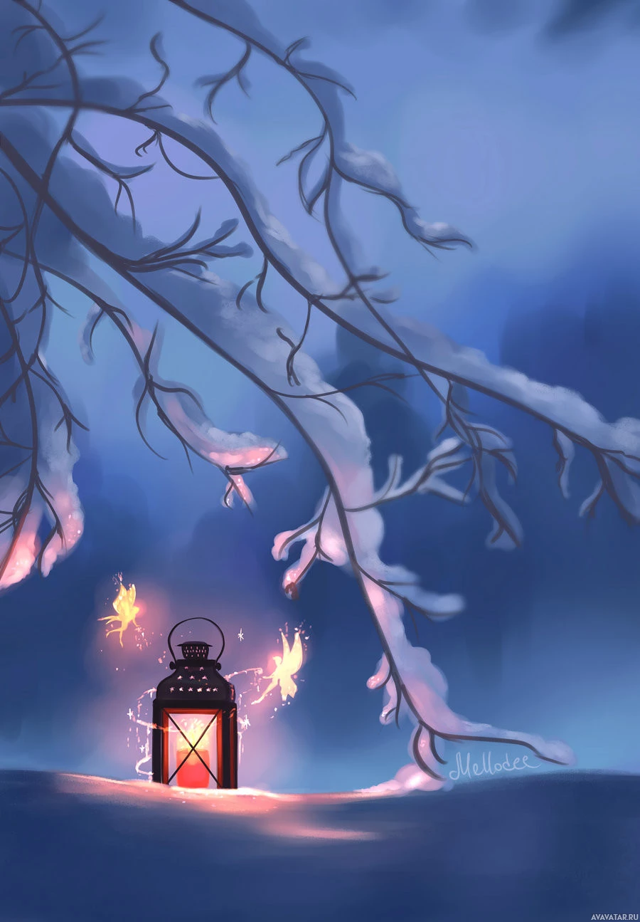 a fantasy scene set during what appears to be winter, given the snow-covered ground and trees. There is a lantern in the center with