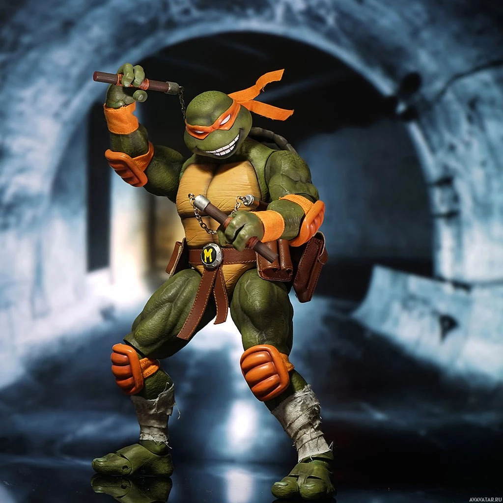 The picture shows a figure of Michelangelo, one of the Teenage Mutant