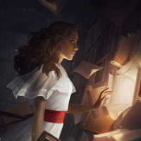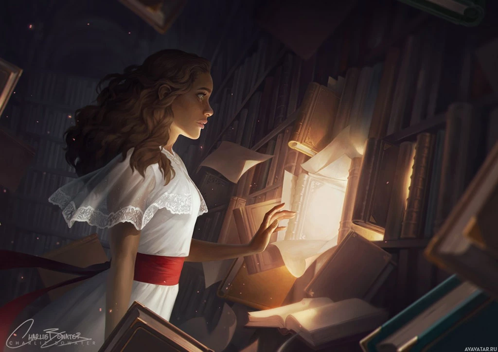 a white dress with a red belt or sash at the waist and a large, dark collar around her neck. Her gaze is directed off to the side, and she appears thoughtful or contemplative. The setting suggests a library or