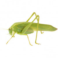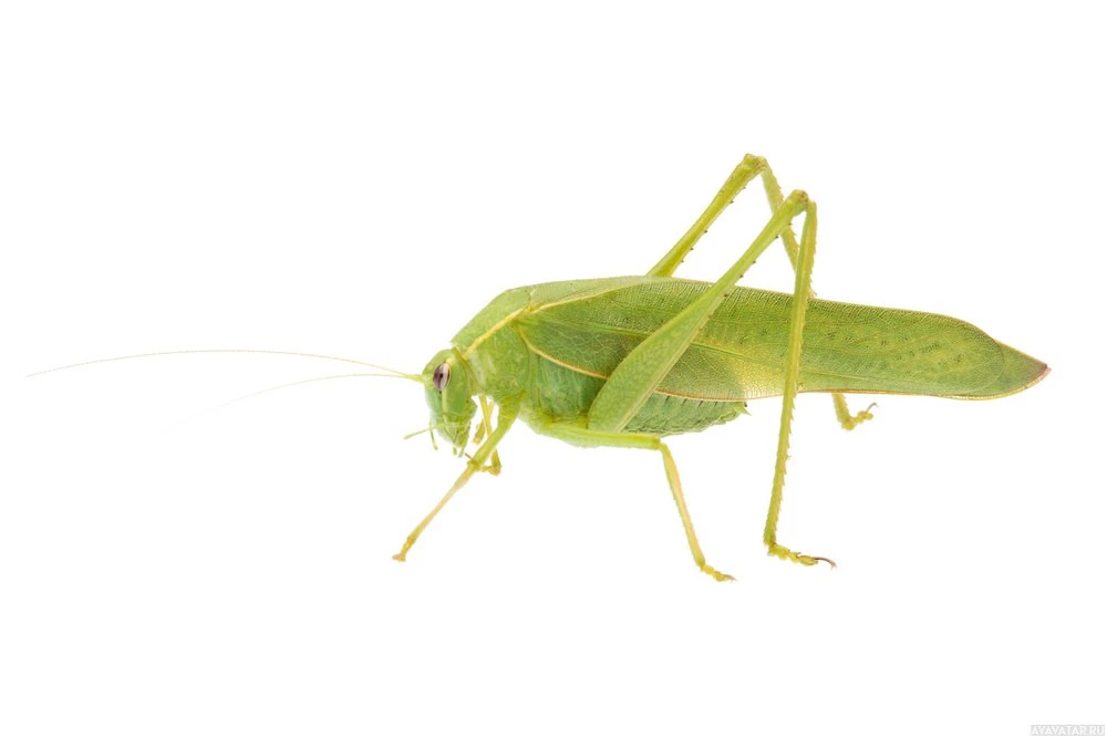 На снимке изображено зеленое насекомое, которое выглядит как кузнечик. Он имеет большие задние ноги, характерную черту кузнечиков, и стоит на нейтральном фоне.