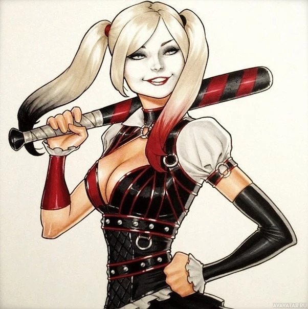 Harley Quinn from the DC Comics universe. She is holding a bat with both hands, smiling wickedly. Harley Quinn is known for her distinctive appearance and