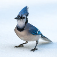 The image shows a bird, specifically a blue jay (Cyanocitta cristata) with its distinctive crest and tail feathers that are a vibrant