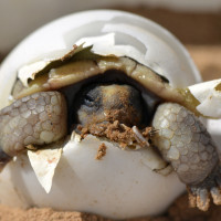 The image shows a small turtle emerging from its egg. It appears to be in the process of hatching, with the cracked shell exposing the turtle's head and front legs. This is a natural behavior for reptiles like turtles when they are ready to break free from their eggs and enter the world.