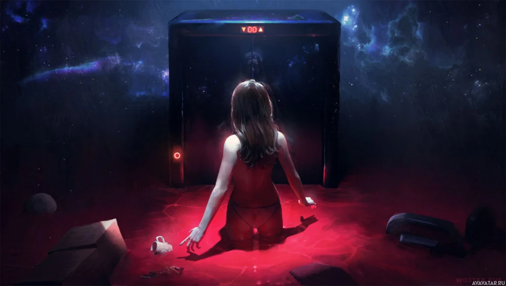 science fiction themes, given the cosmic background and the futuristic elements in the scene. The color palette of the image is quite dramatic, with