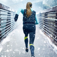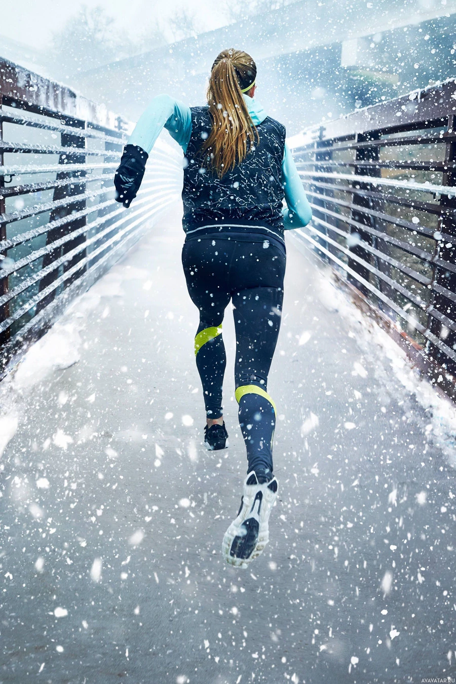 a sleeveless top. The background features a bridge covered in snow, suggesting it might be during winter or the photo could have been taken in an area that experiences snowfall. The snow appears to be falling, as evidenced by the visible