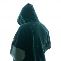 The image shows a person from behind, wearing a hoodie. The hoodie has