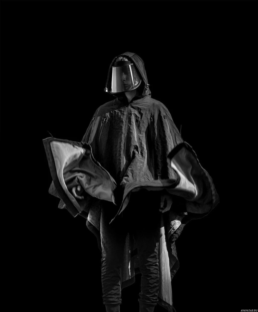 the Star Wars franchise, specifically designed to look like the cloak and mask worn by the Sith Lord Darth Vader. The person is also holding what appears to be a lightsaber, another