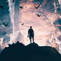 person at a distance. Outside of the cave, multiple birds are visible against the sky, which has