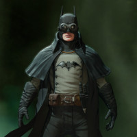The image features a character that appears to be an updated version of Batman, standing in a gritty,